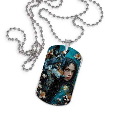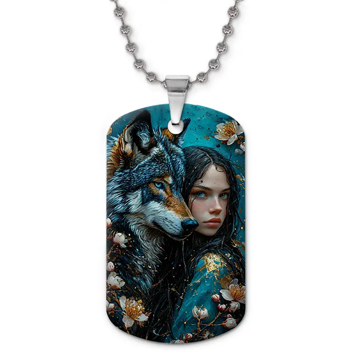 Кулон-жетон «Девушка и волк» — двухсторонний аксессуар из алюминиевого сплава.