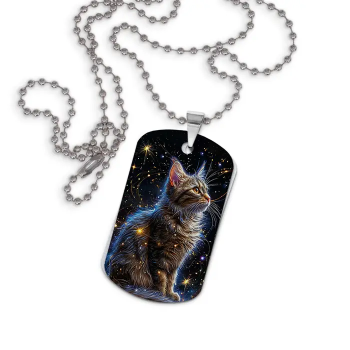Кулон-жетон «Кот космос» — двухсторонний аксессуар из алюминиевого сплава с цветным изображением.