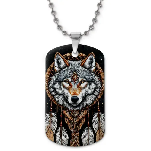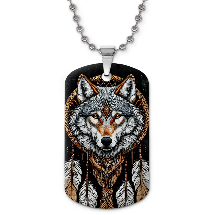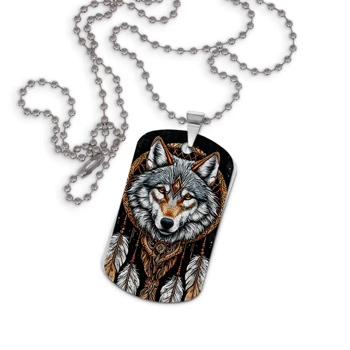 Кулон-жетон «Волк ловец снов» — аксессуар из алюминиевого сплава с двусторонним цветным изображением.