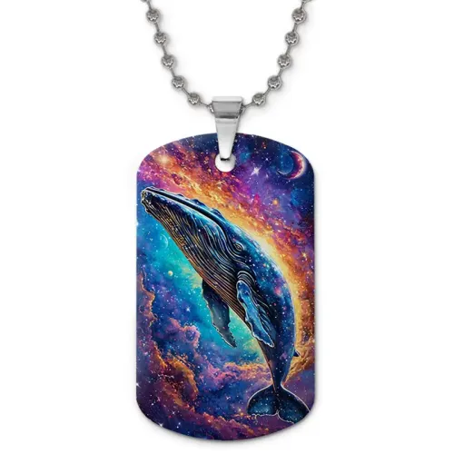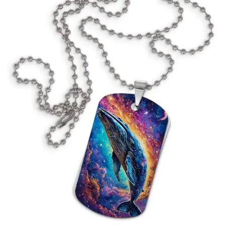 Кулон-жетон с двухсторонним изображением кита и космической тематики, выполненный из алюминиевого сплава.