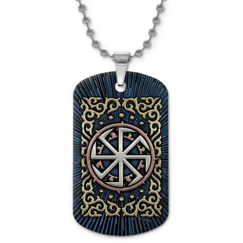 Двухсторонний кулон-жетон из алюминиевого сплава с цветным изображением славянского символа Коловрат.