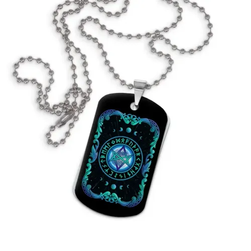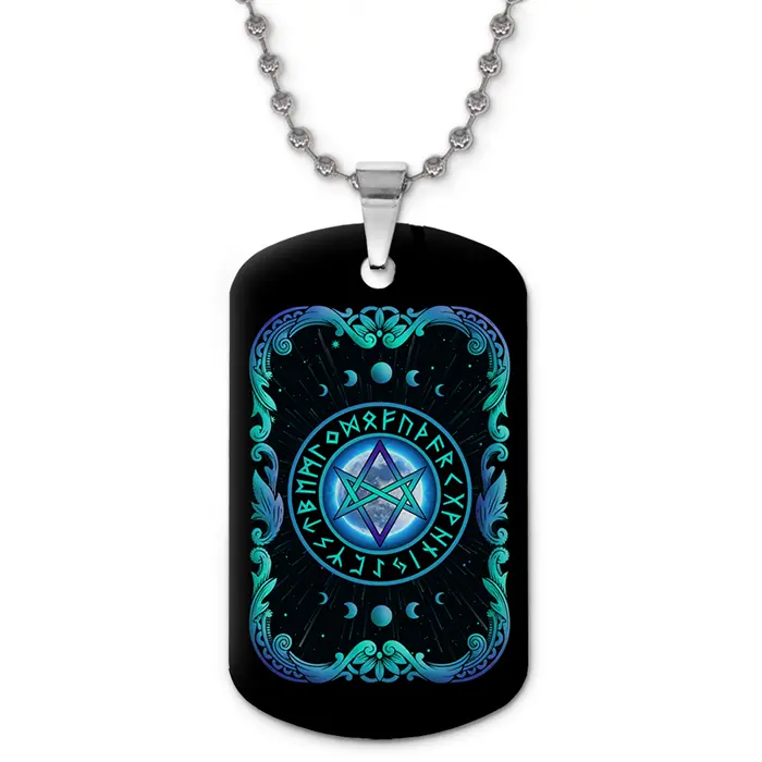 Двухсторонний кулон-жетон из алюминиевого сплава с изображением уникурсальной гексаграммы.