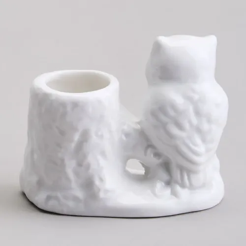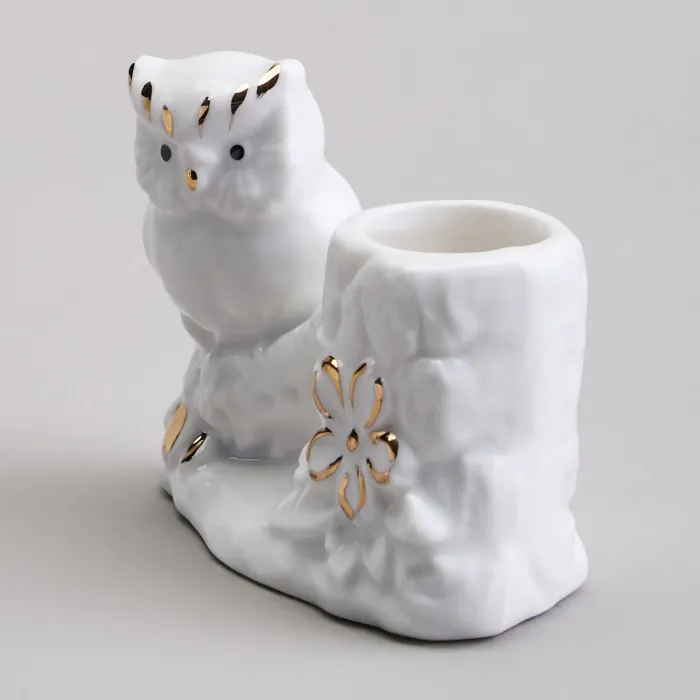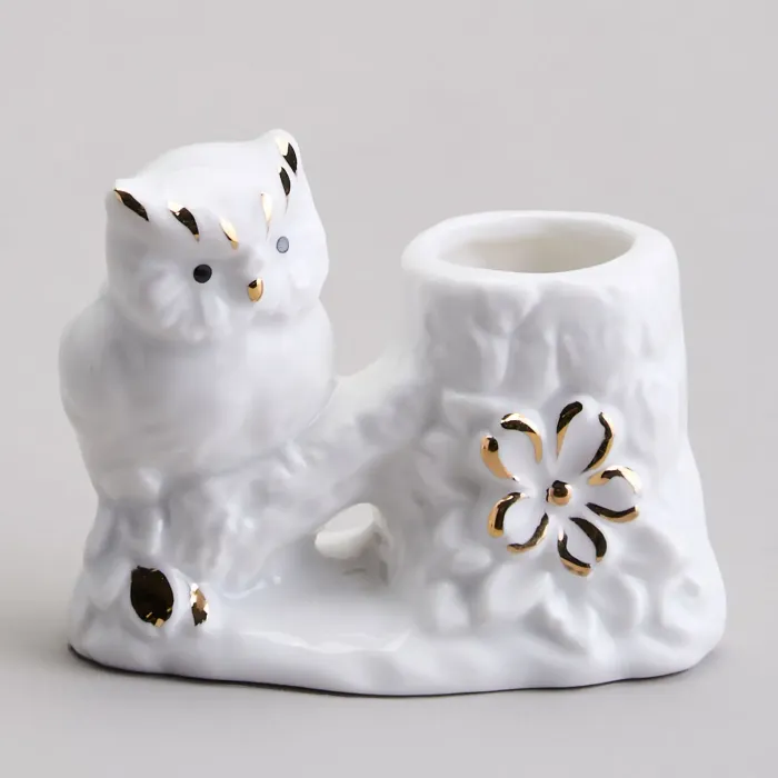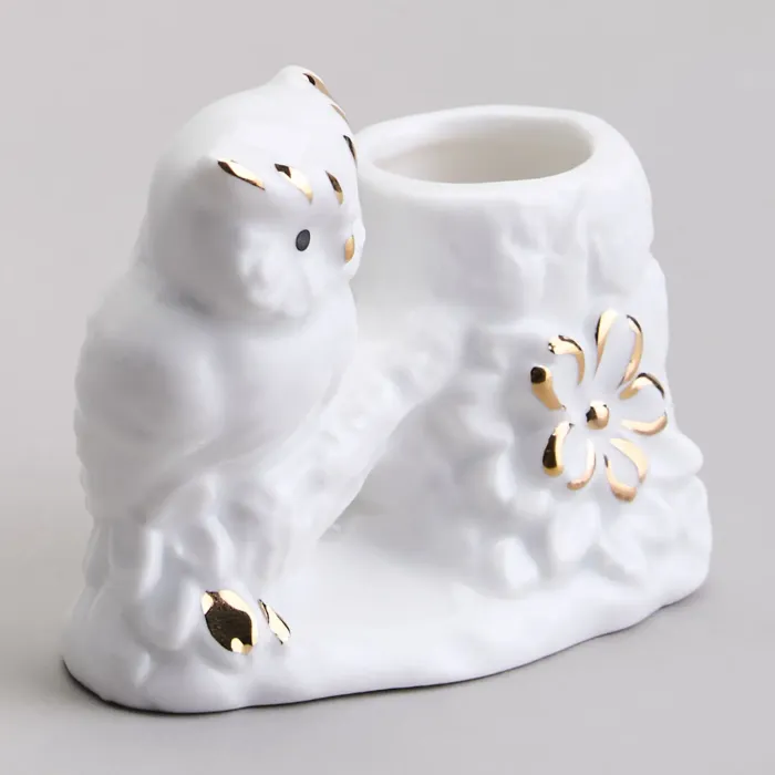 Подставка изготовлена из фарфора, материала, известного своей прочностью и гигиеничностью. Фигурка совы детализирована и украшена золотыми акцентами, нанесёнными поверх глазури. Основание изделия декорировано цветочными мотивами, а конструкция предусматривает удобное размещение зубочисток.