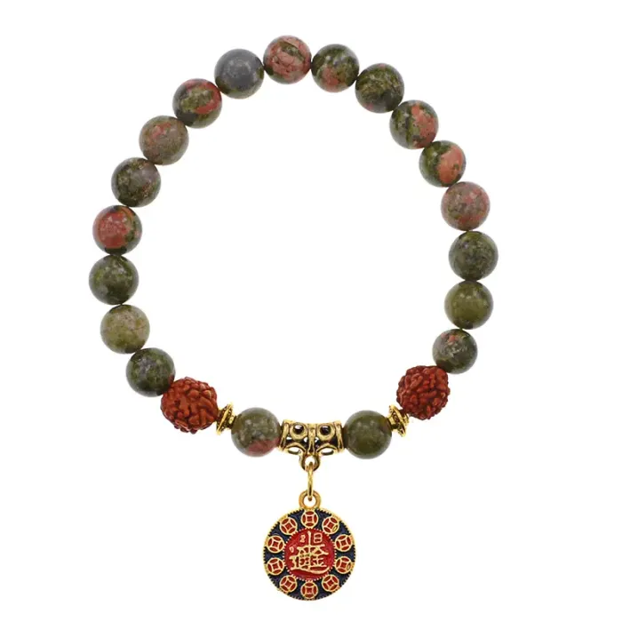 Стрейч-браслет из натурального камня унакит с бусинами рудракши и металлической подвеской.
