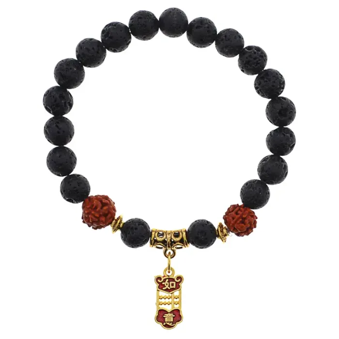 Стрейч-браслет из натурального камня лава, украшенный рудракшей и металлической подвеской.