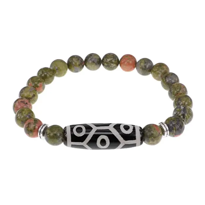 Стрейч-браслет из натурального камня унакит с тибетской бусиной Дзи из агата.