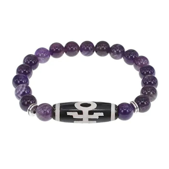 Стрейч-браслет из натурального камня с тибетской бусиной Дзи. Материал: агат и аметист.