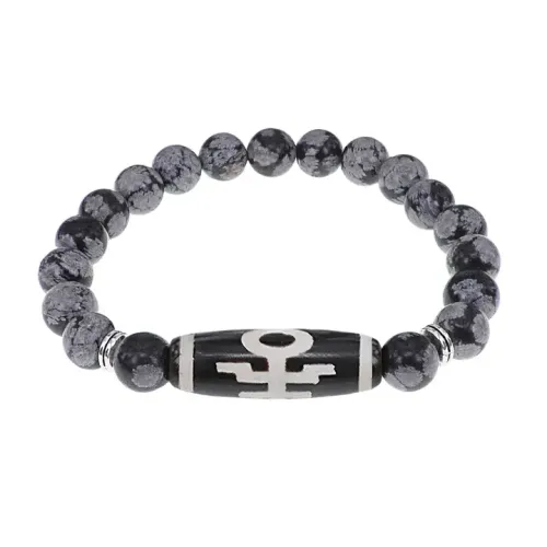 Стрейч-браслет для ношения, выполненный из натурального снежного обсидиана и агатовой бусины Дзи.