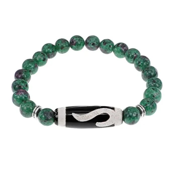 Стрейч-браслет из синтетического камня с тибетской бусиной Дзи из натурального агата.