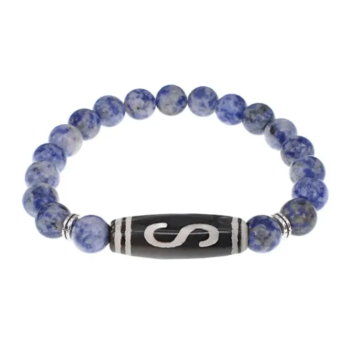 Стрейч-браслет из натурального камня содалит, украшенный тибетской бусиной Дзи из агата.