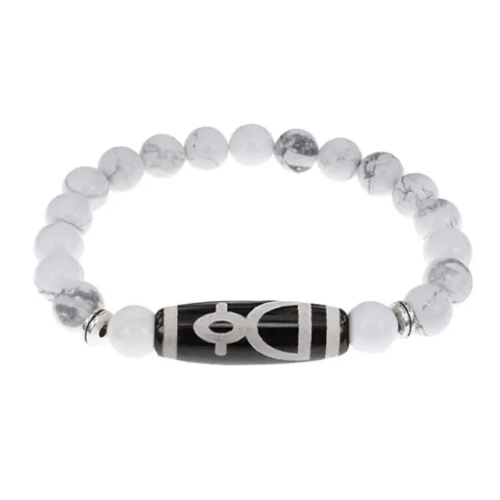 Стрейч-браслет из натурального камня кахолонг с тибетской бусиной Дзи из агата.