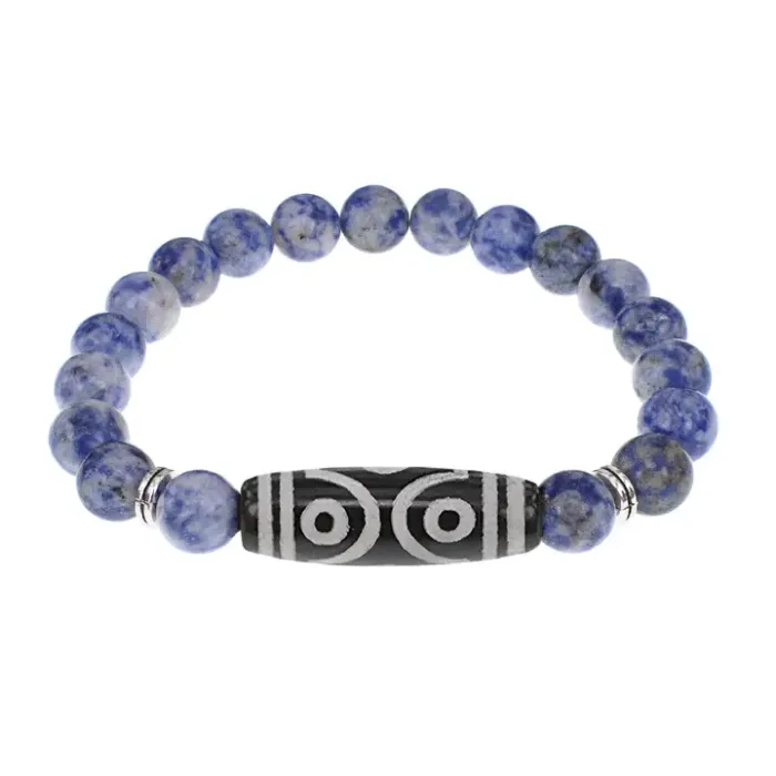 Стрейч-браслет из натурального камня содалит, украшенный тибетской бусиной Дзи из агата.