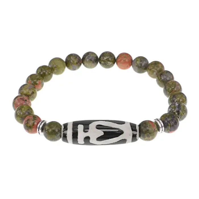 Стрейч-браслет из натурального камня унакит с тибетской бусиной Дзи Бумпа из агата.