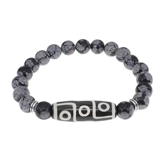Стрейч-браслет из натурального камня снежный обсидиан с тибетской бусиной Дзи из агата.