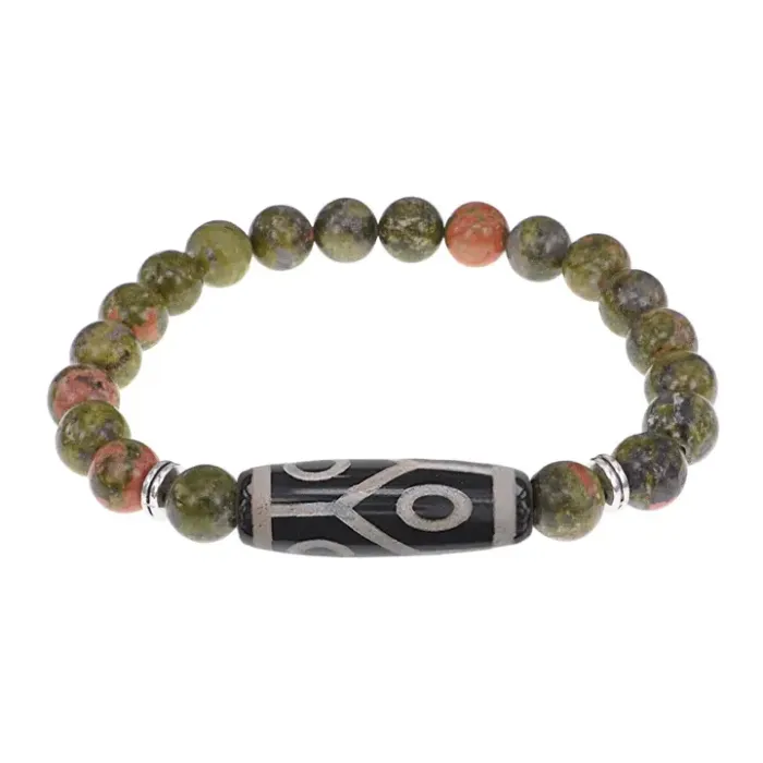 Стрейч-браслет из натурального камня унакит с тибетской бусиной Дзи из агата.