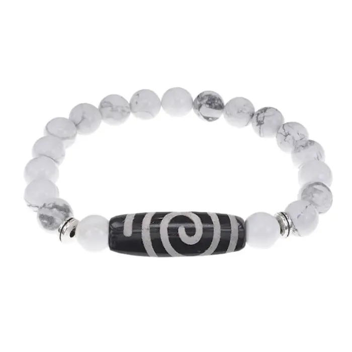 Стрейч-браслет для ношения в качестве аксессуара, выполненный из натурального камня кахолонг и агатовой бусины Дзи с тибетским символом.