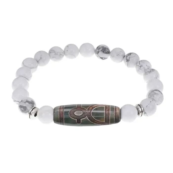 Стрейч-браслет из натурального камня с тибетской бусиной Дзи. Материал: агат и кахолонг.