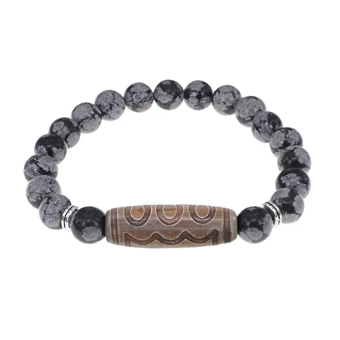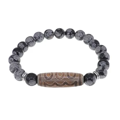 Стрейч-браслет из натурального камня с тибетской бусиной Дзи из агата и бусинами снежного обсидиана.