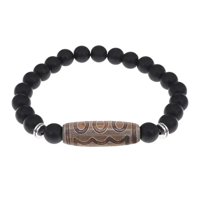 Стрейч-браслет с тибетской бусиной Дзи из агата и синтетическим шунгитом.