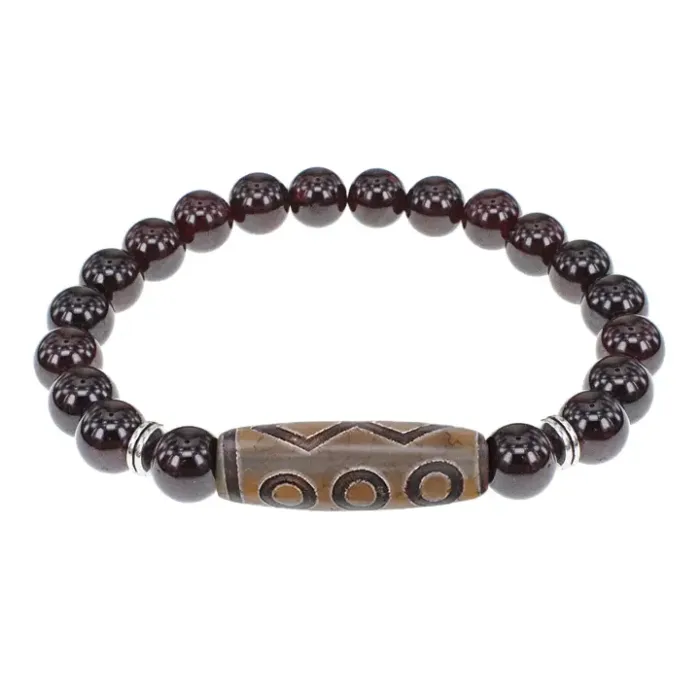 Стрейч-браслет из натурального камня граната с тибетской бусиной Дзи из агата.