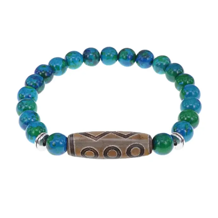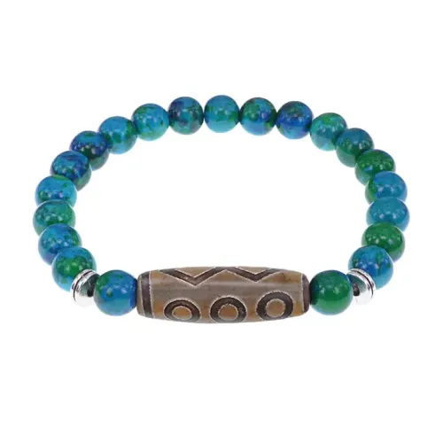 Стрейч-браслет из синтетического камня с тибетской бусиной Дзи из натурального агата.