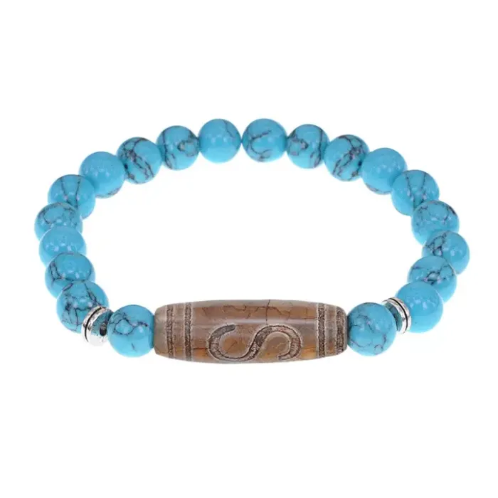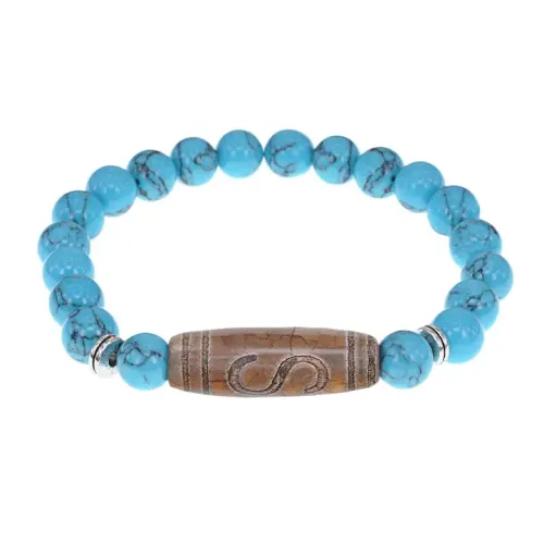 Стрейч-браслет с тибетской бусиной Дзи из натурального агата и синтетическим камнем бирюзы.