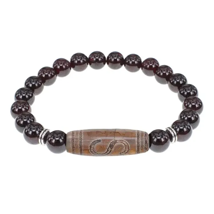 Материал и изготовление: Натуральный гранат, тибетская бусина Дзи из агата, стрейч-материал.