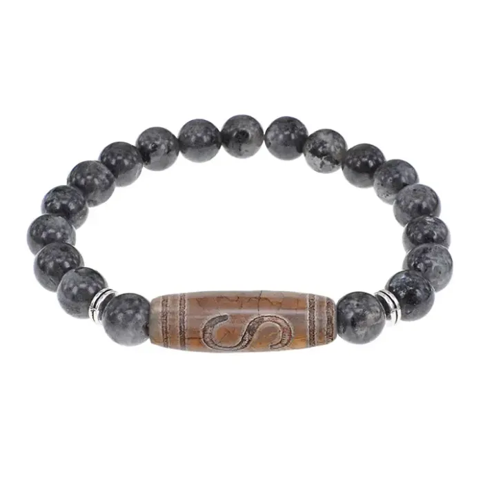 Стрейч-браслет для ношения, состоящий из бусин натурального камня лабрадор и тибетской бусины Дзи из агата с резным узором.