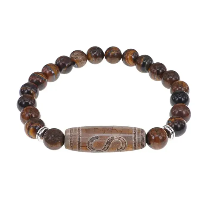 Стрейч-браслет для ношения, изготовленный из натурального камня тигровый глаз и агатовой бусины Дзи с тибетским символом.