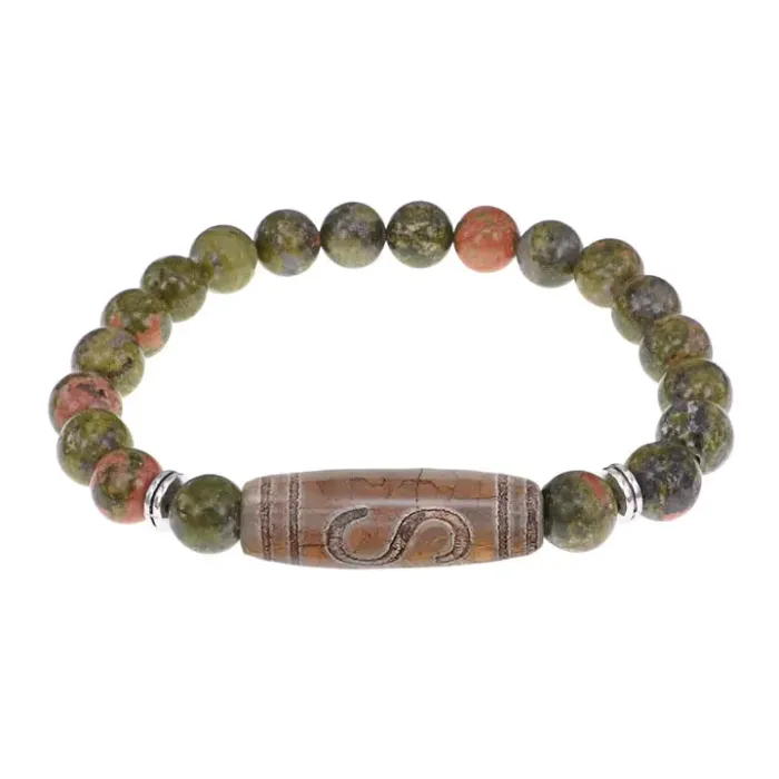 Стрейч-браслет из натурального камня унакит с бусиной Дзи из агата.