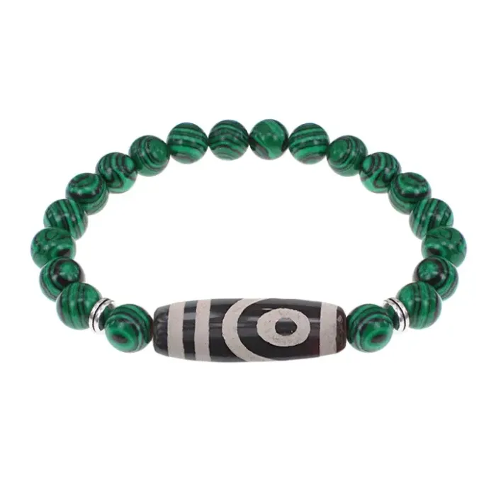 Стрейч-браслет с тибетской бусиной Дзи из агата и синтетическим камнем малахит.