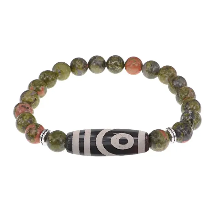 Стрейч-браслет из натурального камня унакит с тибетской бусиной Дзи из агата.