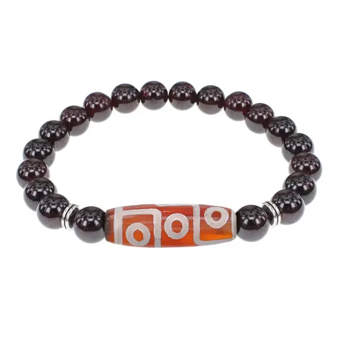 Стрейч-браслет из натурального камня гранат с тибетской бусиной Дзи из агата.