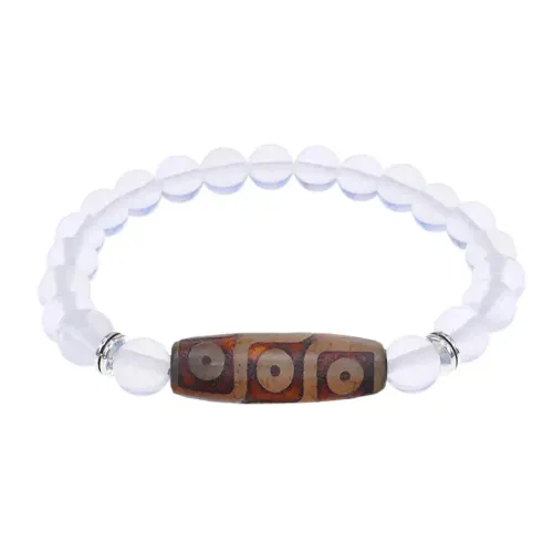 Материал и изготовление: Натуральный агат (бусина Дзи), синтетический лунный камень, эластичная нить.