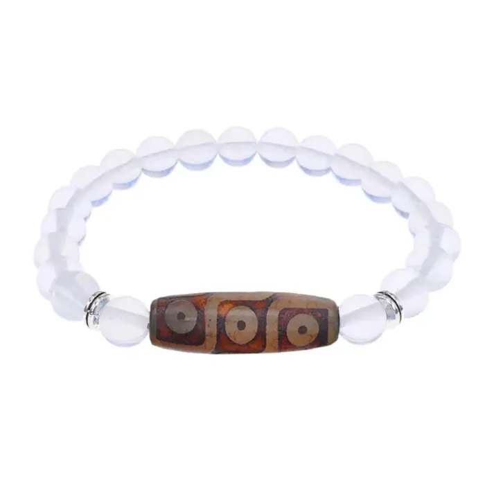 Стрейч-браслет с тибетской бусиной Дзи из агата и синтетическим лунным камнем.