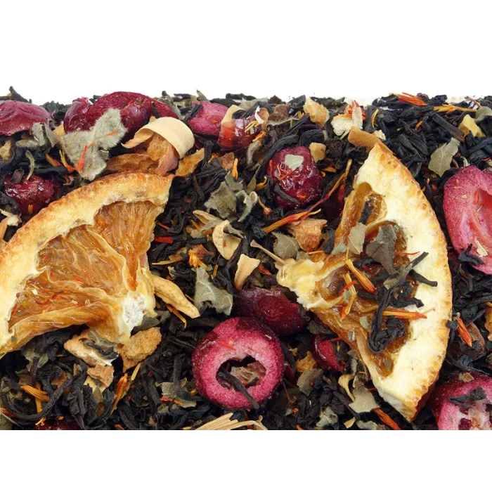Состав: Чай чёрный рассыпной листовой крупный, ароматизаторы, сегменты апельсина, кусочки абрикоса, листья ежевики, слайсы клюквы, ягоды красной смородины, лепестки апельсина, лепестки сафлора.