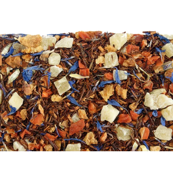 Состав: ройбуш, цукаты ананаса (ананас, сахар, регулятор кислотности — лимонная кислота), кусочки сушёной моркови, кусочки абрикоса, ароматизатор, лепестки василька.
