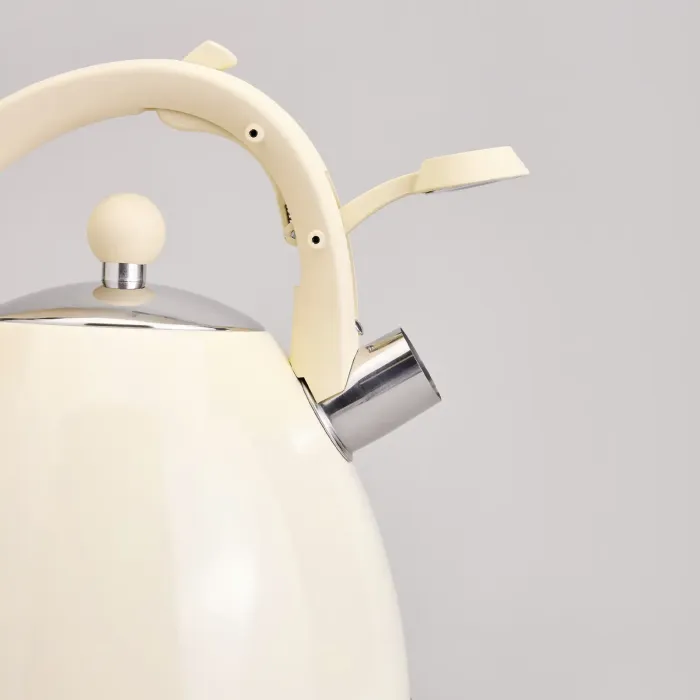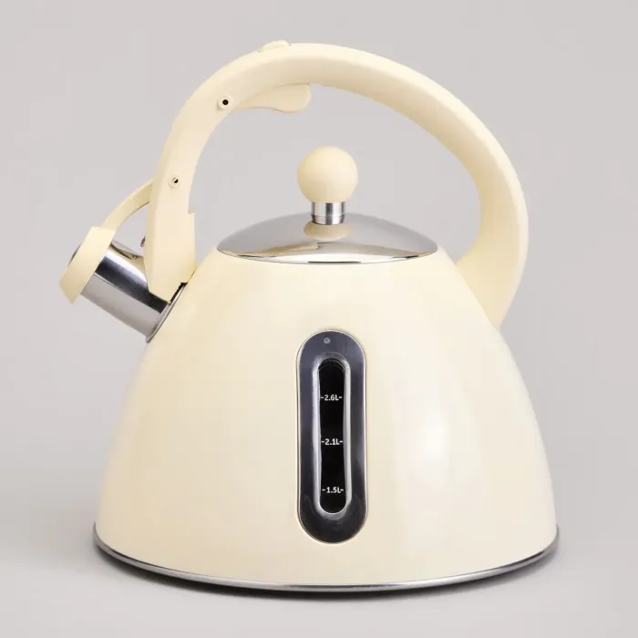 Корпус выполнен из нержавеющей стали. Дно чайника — капсульное термоаккумулирующее с алюминиевой пластиной, что ускоряет нагрев. Конструкция включает свисток для сигнала о закипании, индикатор уровня воды на корпусе и клапан на ручке для удобного наливания. Ручка имеет жаропрочное покрытие.