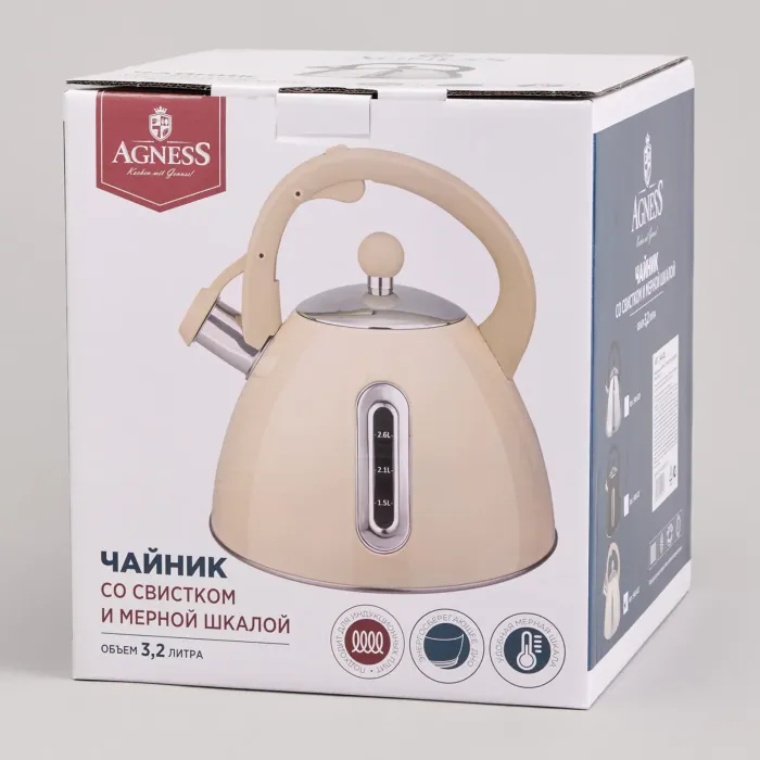 Чайник со свистком и мерной шкалой Agness объёмом 3.2 литра предназначен для кипячения воды на плите. Изготовлен из нержавеющей стали, что обеспечивает прочность и гигиеничность.
