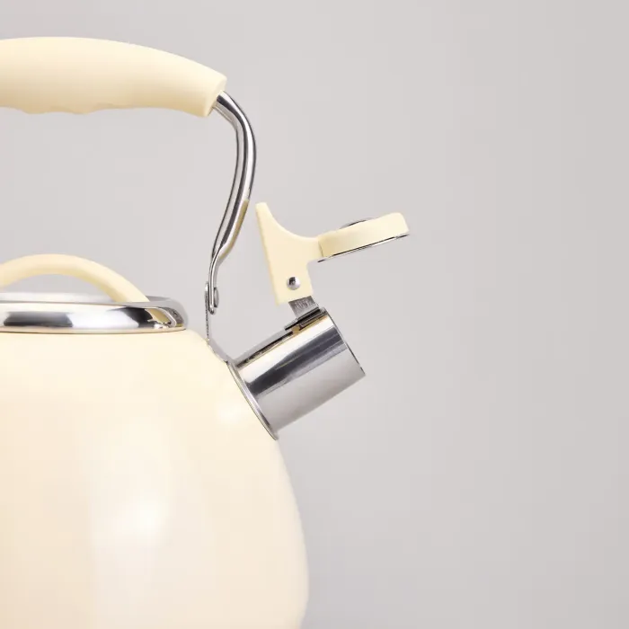Корпус выполнен из нержавеющей стали. Термоаккумулирующее дно имеет алюминиевую прослойку для равномерного и быстрого нагрева. Конструкция включает встроенный свисток для сигнала о закипании и складывающуюся ручку, которая упрощает хранение. На ручке расположен клапан для налива воды.