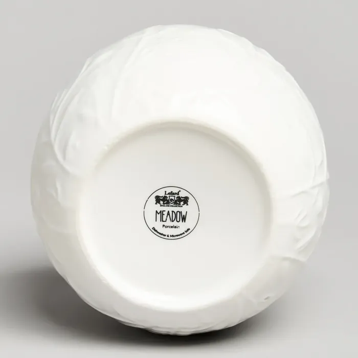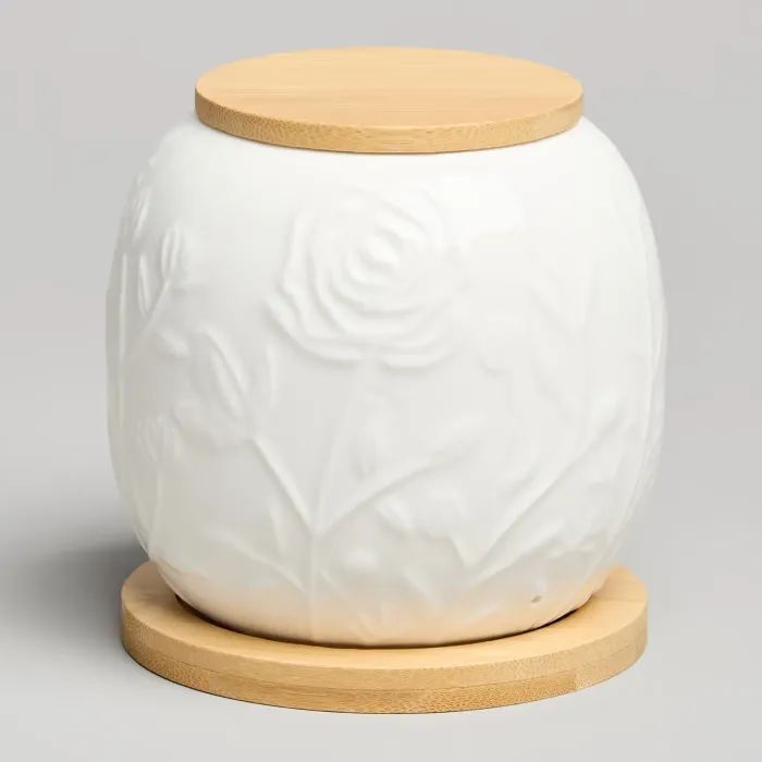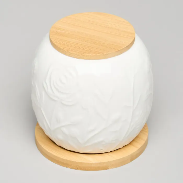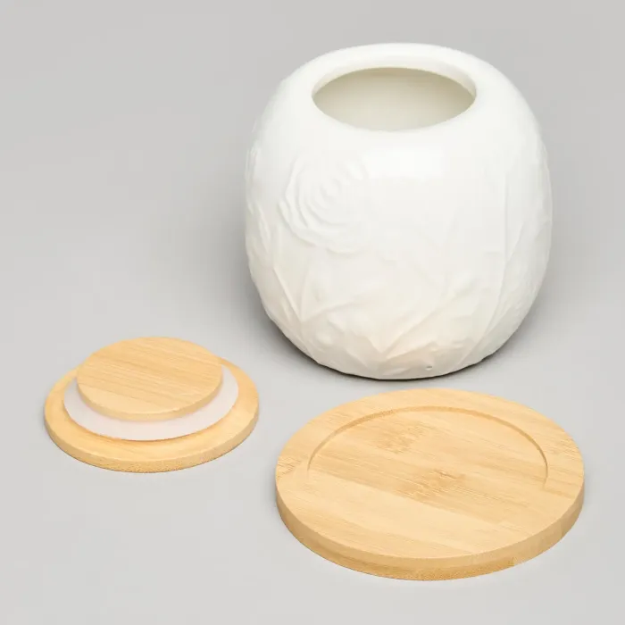 Корпус банки выполнен из белого фарфора с нанесённым декором в виде цветов и луговых трав. Материал обладает гигиеничностью и устойчивостью к воздействию высоких температур. Деревянная крышка обеспечивает плотное закрытие, а подставка из того же материала придаёт изделию устойчивость и завершённый внешний вид.