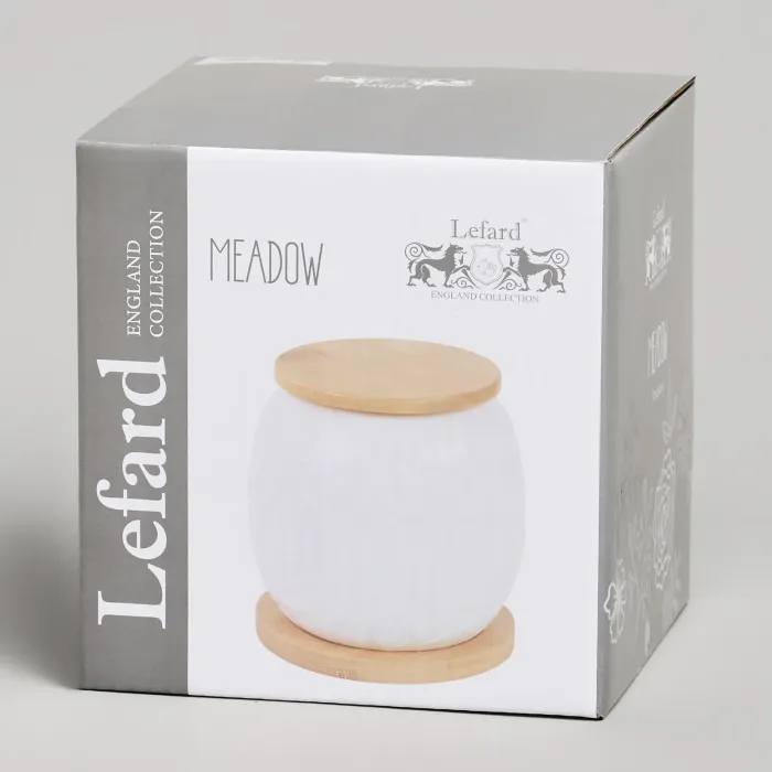 Банка из коллекции Meadow от бренда Lefard предназначена для хранения сыпучих продуктов и других кухонных принадлежностей. Изделие изготовлено из фарфора и дополнено элементами из дерева, что обеспечивает сочетание функциональности и декоративных качеств.