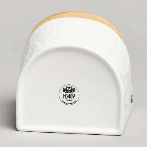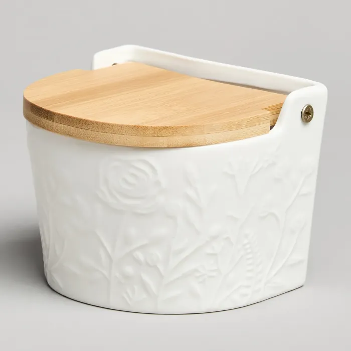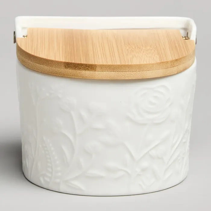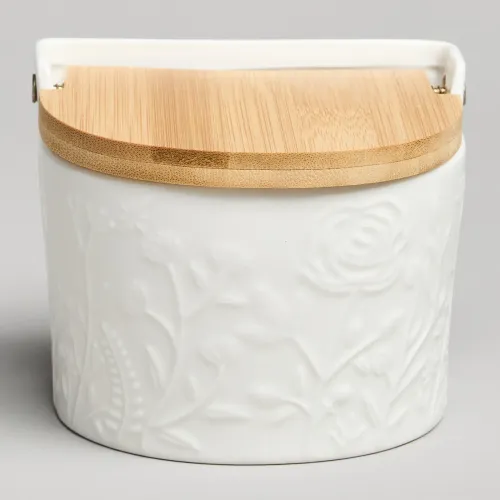 Корпус банки выполнен из фарфора, что обеспечивает гигиеничность и устойчивость к воздействию пищевых продуктов. Крышка изготовлена из бамбука, который является натуральным материалом. Фарфоровую часть можно мыть в посудомоечной машине и использовать в микроволновой печи.