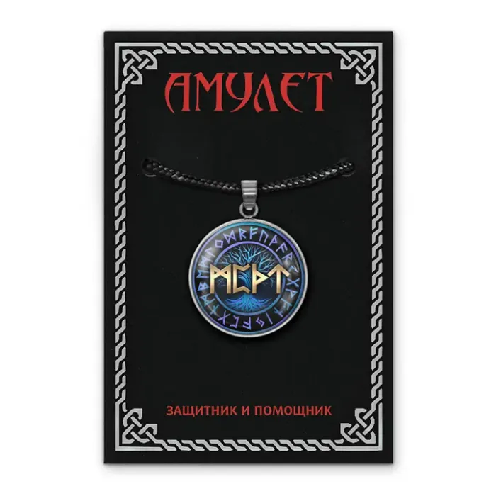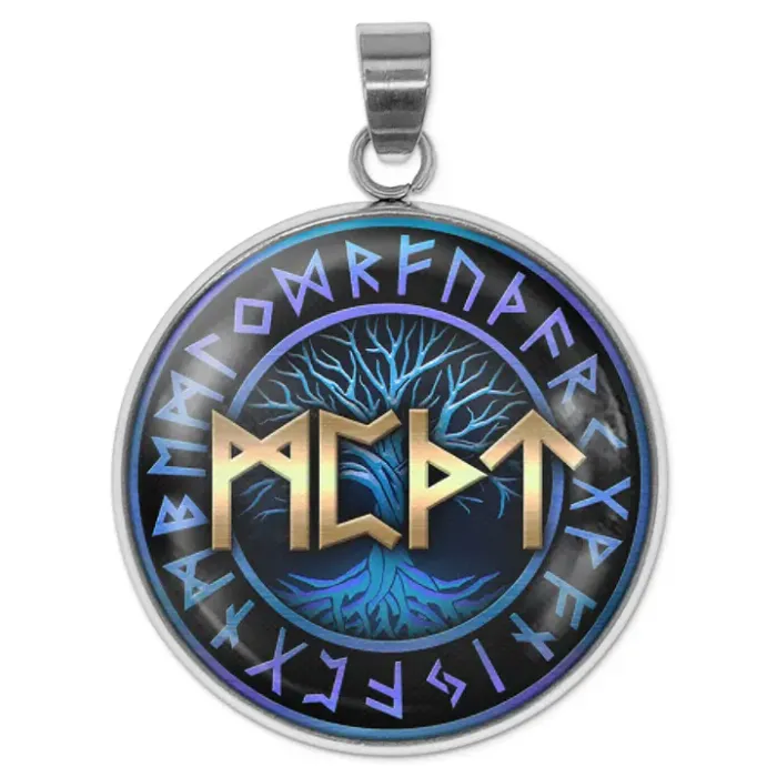 Кулон-амулет из нержавеющей стали с символикой рун Манназ, Перт, Турисаз и Тейваз. Изображение защищено выпуклой стеклянной линзой.