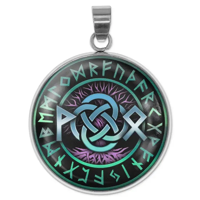 Кулон-амулет из нержавеющей стали с выпуклой стеклянной линзой.
