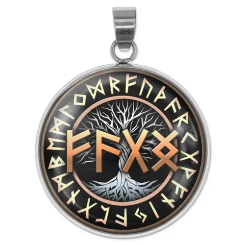 Кулон-амулет из нержавеющей стали с изображением под выпуклой стеклянной линзой.
