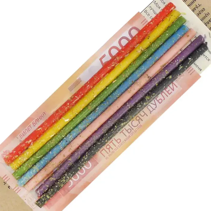 Набор из семи восковых свечей для сувенирного или ритуального использования. Каждая свеча имеет определённый цвет и содержит травяные добавки.