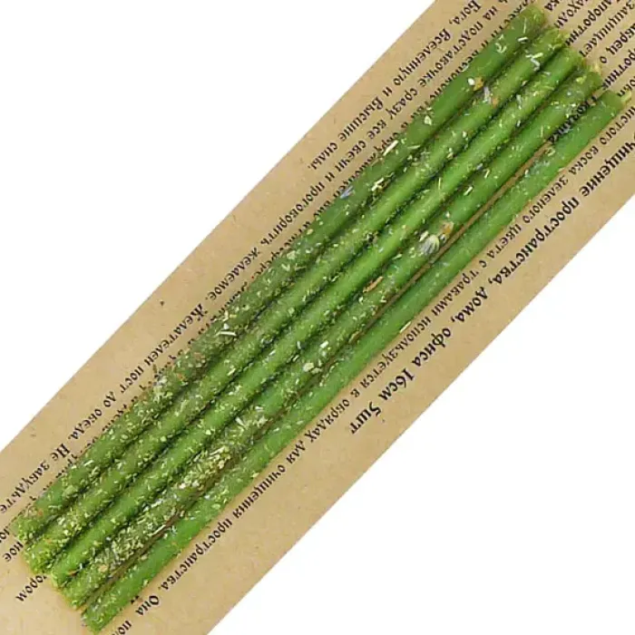 Набор из пяти восковых свечей зелёного цвета с добавлением трав для использования в качестве интерьерного декора или сувенира.