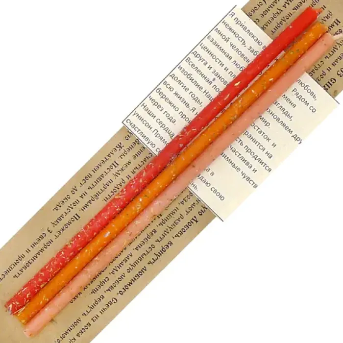 Набор из трёх восковых свечей для обрядов. Свечи красного, оранжевого и розового цвета.