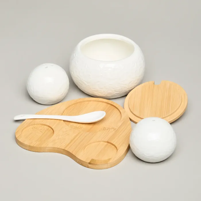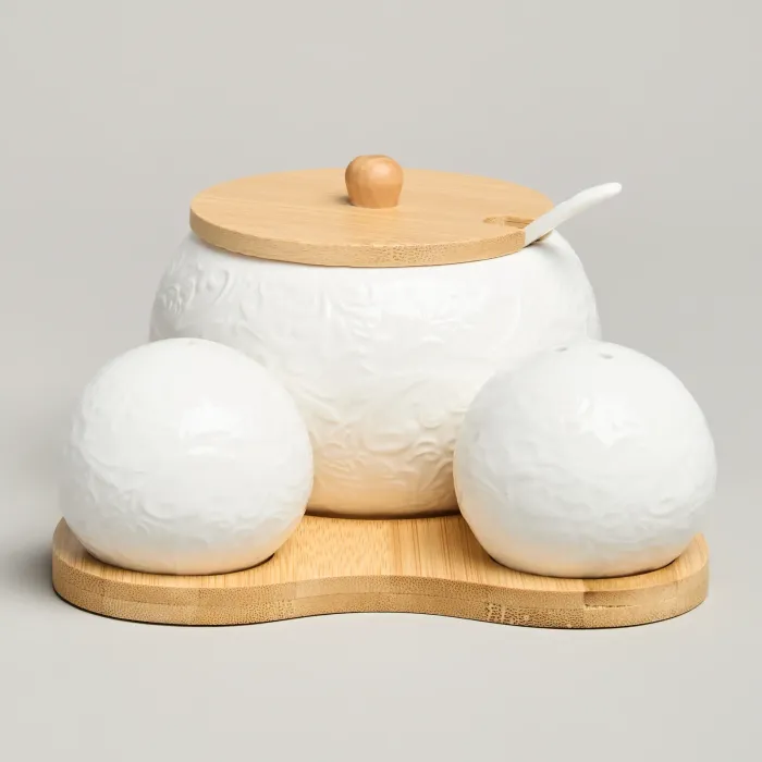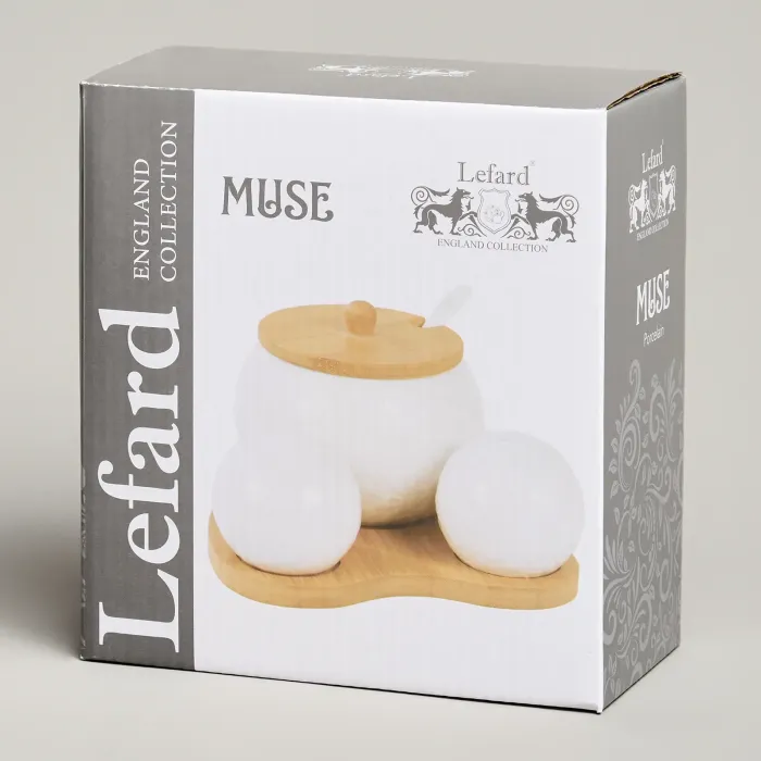 Набор для специй Muse от Lefard состоит из трёх предметов на деревянной подставке. Основная функция набора — хранение и подача специй. Ключевые преимущества включают использование белоснежного фарфора и наличие бамбуковой подставки.